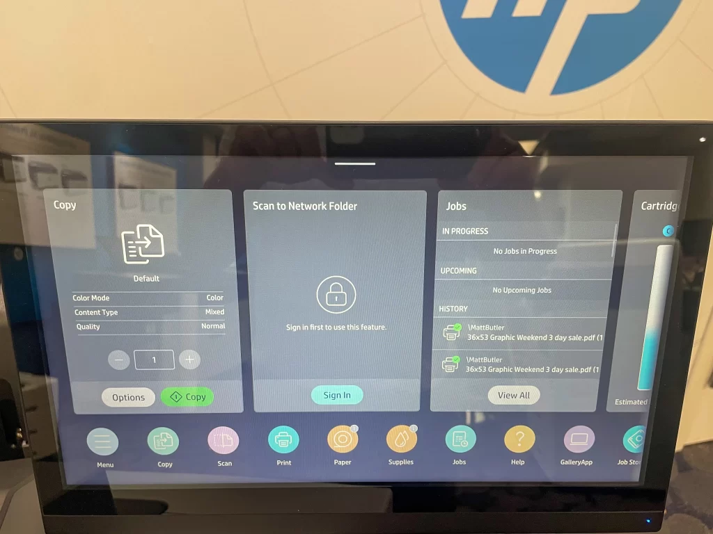 The HP DesignJet XL 3800 isn’t just about specs; it’s about delivering a superior user experience. Its intuitive touchscreen interface simplifies the printing process, allowing you to customize settings and monitor print progress with ease. With seamless connectivity options, including Wi-Fi and mobile printing, you can control your print jobs from anywhere, ensuring your projects stay on track even when you’re not in the office. HP has also included single click funcitonality to all of your favorite actions.