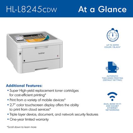 For organizations looking to keep costs low, the HL-L8245CDW supports Brother Genuine TN229XXL super high-yield toner cartridges, providing up to 4,500 pages black and 4,000 pages per color for a low cost per page. It also comes with 3,000-page black and 1,400-page color toner cartridges out of the box, ensuring built-in value from the start.