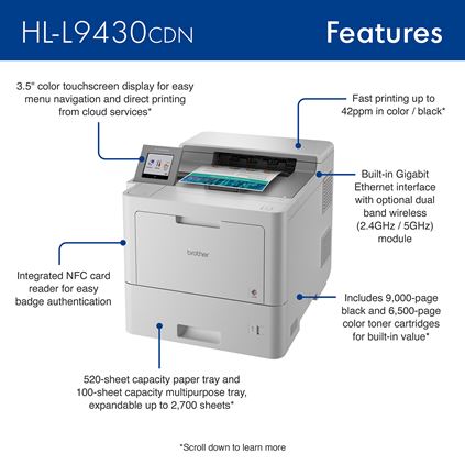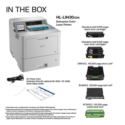 The HL-L9430CDN is equipped with Brother Genuine 9,000-page black and 6,500-page color toner cartridges for built-in value, minimizing the need for frequent cartridge replacements. For businesses that require even more cost efficiency, the printer supports super high-yield toner cartridges that print up to 15,000 pages in black and 12,000 pages in color, offering the lowest cost per page ever from Brother.