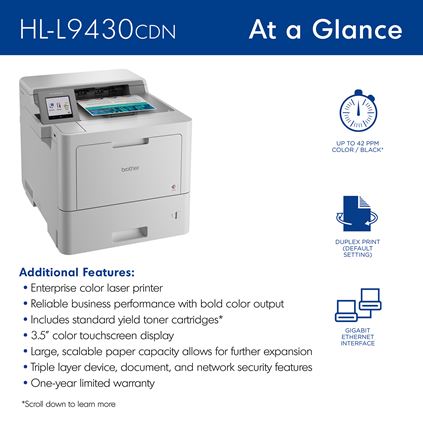 The Brother Workhorse HL-L9430CDN is an Enterprise Color Laser Printer designed to meet the demands of mid to large-sized workgroups with high-volume printing needs. It delivers Brother's fastest color laser print speeds to date, at up to 42 pages per minute, ensuring your team stays productive even during peak workloads. Whether printing business reports, brochures, or presentations, this printer provides bold and vibrant color output with sharp black text for professional-quality documents.