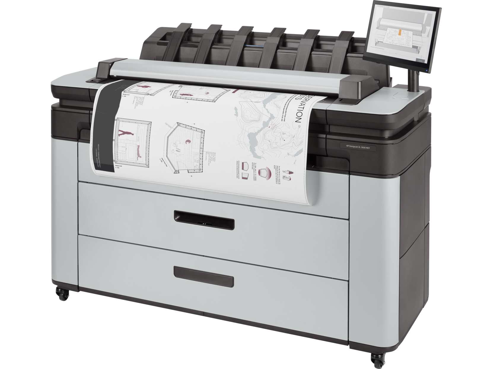 The HP Designjet 3600 wide format printer delivers superior performance at a modest price. At Eastern Engineering we stock this device as a two roll printer and it also comes with a the scanner and touchscreen. The touchscreen interface is simple to use. The main difference in this unit as compared to other designjets are: